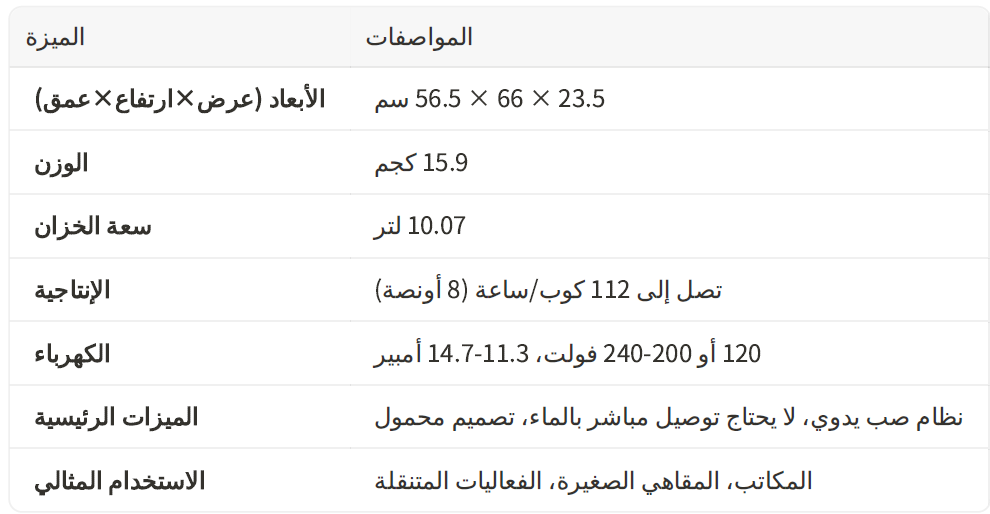 وتوزيع متسا وٍ للماء. بفضل إنتاجيتها التي تصل إلى 112 كوب في الساعة وتصميمها المدمج، تعد هذه الماكينة